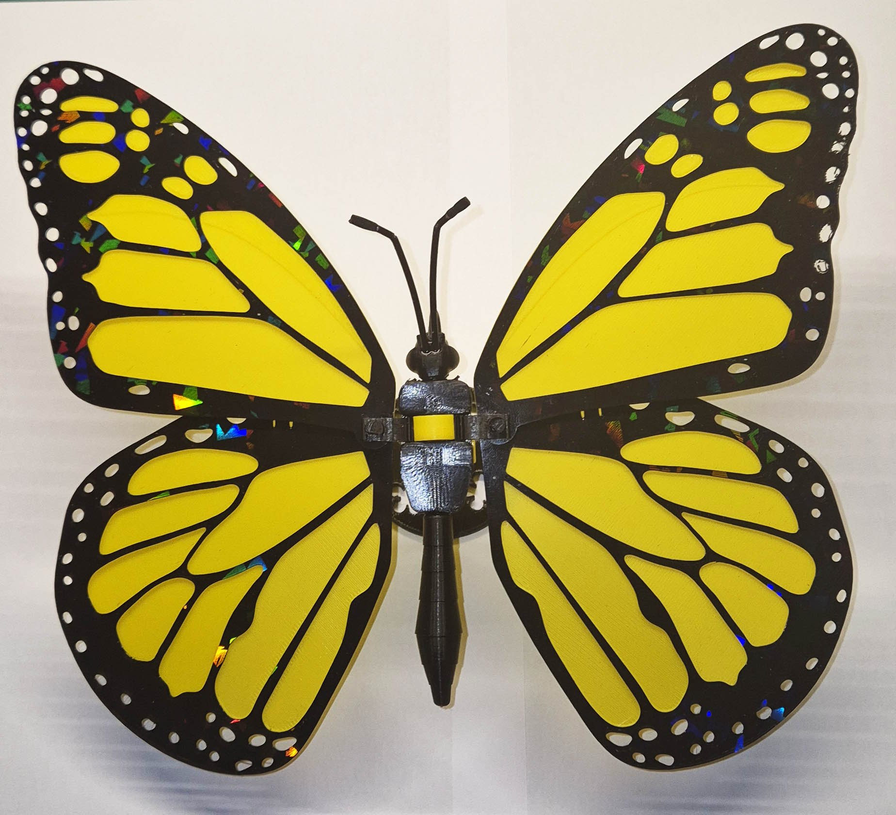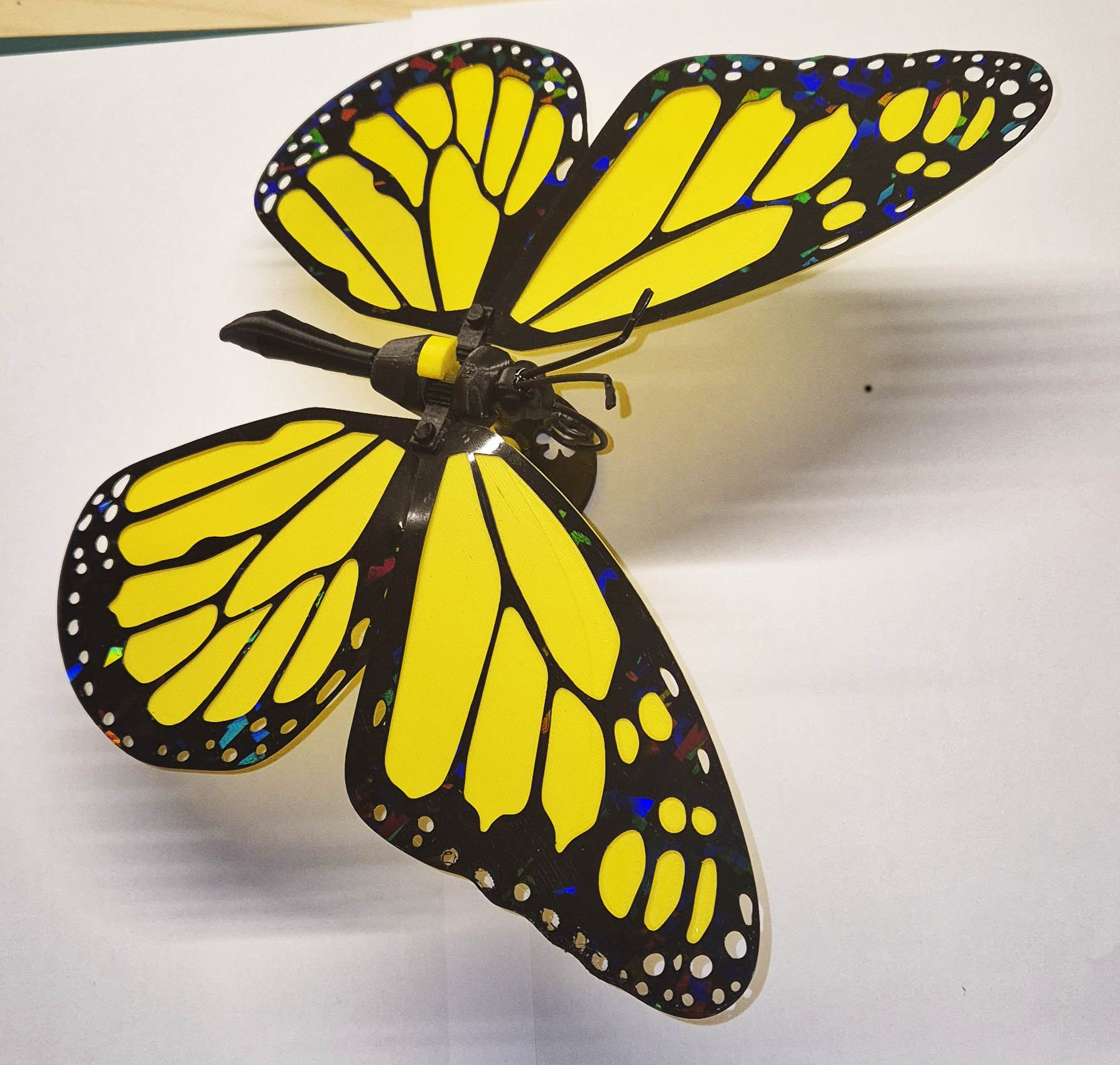 Een leuk object, duurt niet erg lang en kost weinig filament. Helaas is het ontwerp niet helemaal feilloos want de standaard heeft nokjes die direct na het printen en het insteken van de houder met het kogeltje spontaan afbreken. Meerdere keren met andere instellingen geprint maar niks hield ook geen PetG. Uiteindelijk bleek ook de passing niet goed, dus e.e.a. aangepast en in TPU geprint en dat zit nu prima. Maar voor de rest een leuk ontwerp. Op de foto's is het niet heel goed te zien maar ik heb de vleugels op gladde hologram build plate geprint. Dat is alleen zichtbaar voor de zwarte delen, de gele hebben het ook maar dat zit aan de onderzijde. De sprieten en de tong zijn stukjes filament en de draaidelen zitten ook met stukjes filament als asjes gemonteerd. Link naar het ontwerp.
