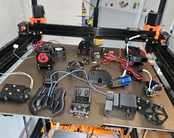 De gehele constructie is nu opgebouwd met de Rapido Plus, Filamentsnijder, een 40x20 blower voor de hotend (in het verleden problemen gehad met een 40x10, en ik kon niet rap een andere vinden), een Nebula extruder voorzien van filamentsensor, 2 LEDs, en een knop om het filament handmatig uit te werpen, een aangepaste houder voor de EBB36, een EBB36 om alles aan te sturen, 2 blowers om de print te koelen, en een aangepaste kap voor de EBB36. De eindstop voor de x-as is nog gewoon uitgevoerd met een schakelaar. Ik was van plan om de x-as sensorless te maken omdat ik ingangen op de EBB36 te kort kwam. Voor testdoeleinden heb ik daar met kunst en vliegwerk de ingangen voor de LEDS, filamentsensor en knop voor gebruikt, zo kon ik in ieder geval verder en bedenken wat ik eigenlijk wilde.