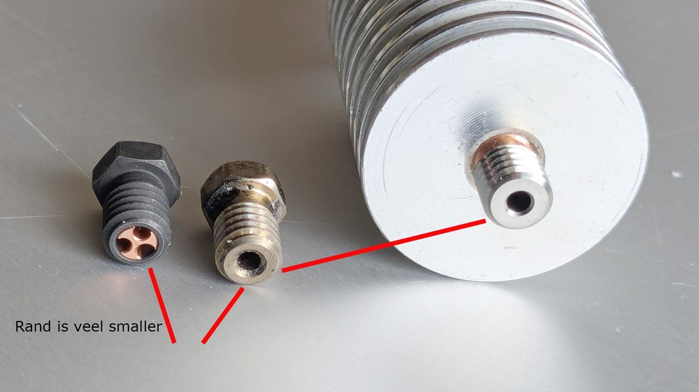 Even een update voor deze nozzels, ik ben inmiddels weer overgestapt naar de normale geharstalen uitvoering, ik had al een paar keer last van lekkage tussen nozzle en coldend, het oppervlak waar de nozzle op het bovenste deel gedrukt wordt is veel smaller omdat het insertje die ruimte in neemt, dus hierdoor is vermoedelijk de kans veel groter dat het gesmolten filament hier tussendoor geperst wordt.