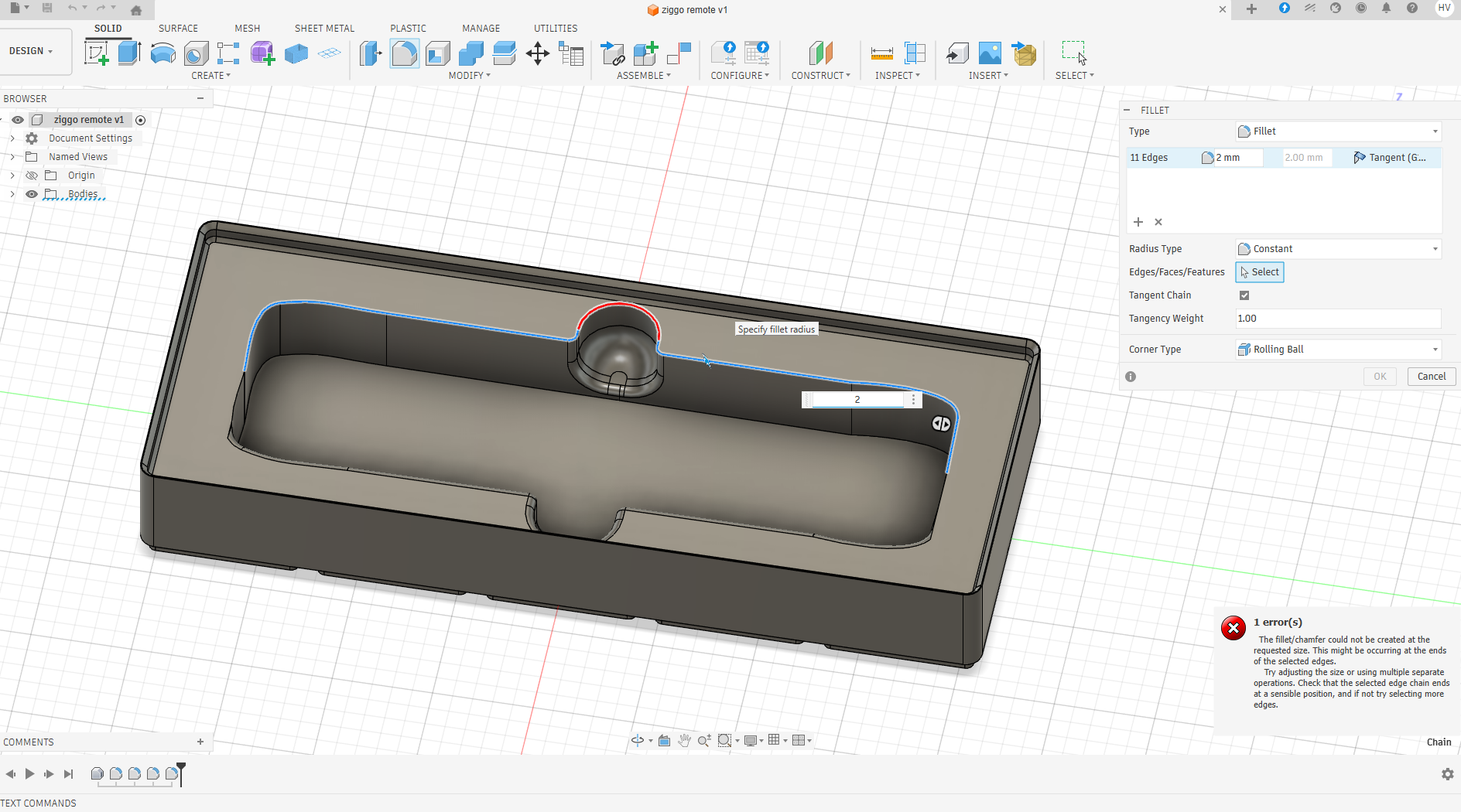 gaat het op een gegeven moment verkeerd . normaal als ik een fillet aan wil brengen worden de lijnen blauw maar nu zijn er lijnen rood , met de melding dat het niet mogelijk is .