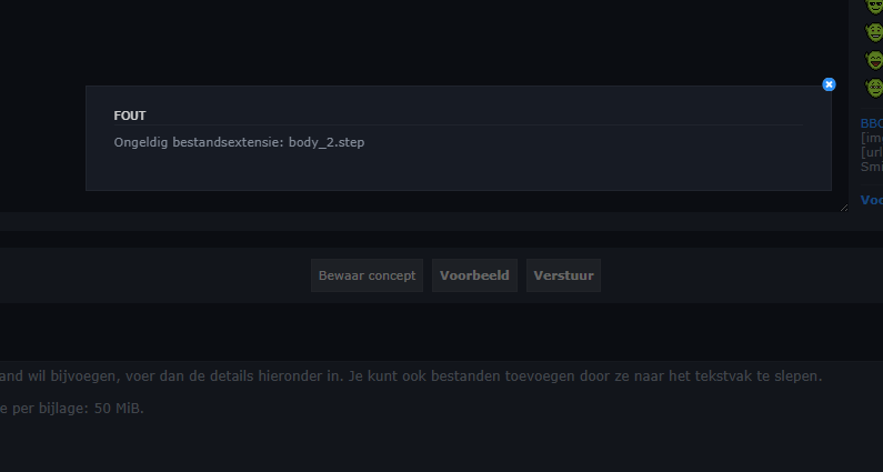 Aha maar dat kan ik oplossen. T'is omdat .step momenteel niet toegelaten is als upload extensie. Is het enkel .step dat programma's gebruiken of vb ook .stp?