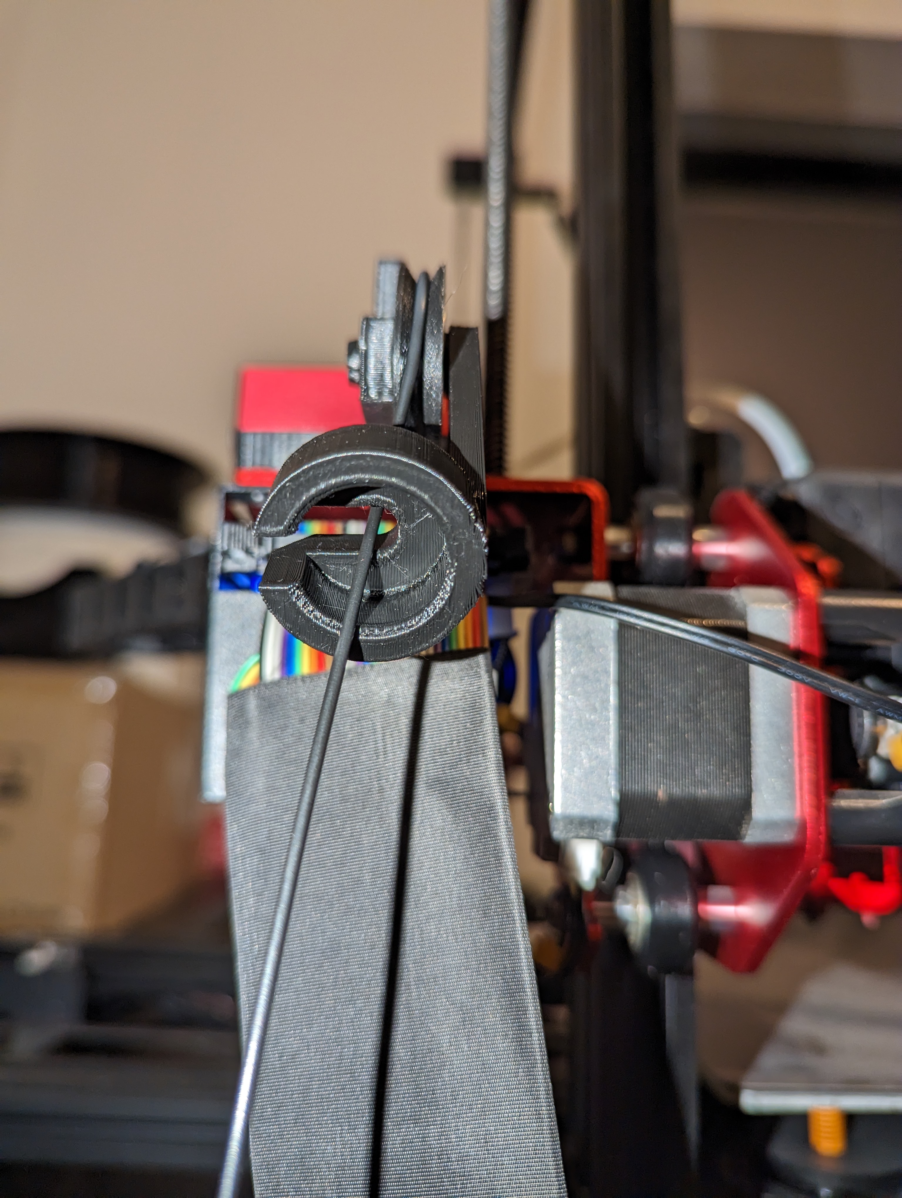 Dus 2 versies van je ingenieuze design zou optimaal zijn. Eentje met de iets meer doorlopende inkeping richting het midden (zou dan gebruikt worden in combinatie met mijn zijdelings gemonteerde spoelhouder, en eentje met de blocker onder een hoek die dan gebruikt kan worden in combinatie met filament op de vloer. Deze laatste zou dan wel een pen mogen hebben die kleiner is in de hoogte (ik heb de dikte van zo'n wiel opgemeten en da's 7mm) en zou ik dan wel vanaf links kunnen inklikken.