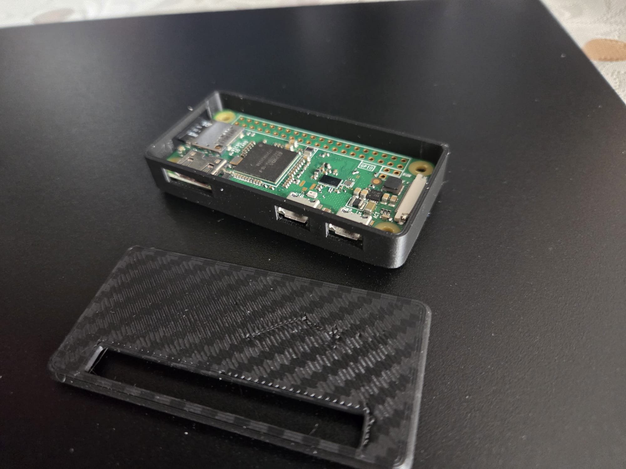 Een doosje voor een Raspberry Pi Zero W. Ik was te snel met het van de plaat afhalen waardoor er wat stukjes uit zijn.