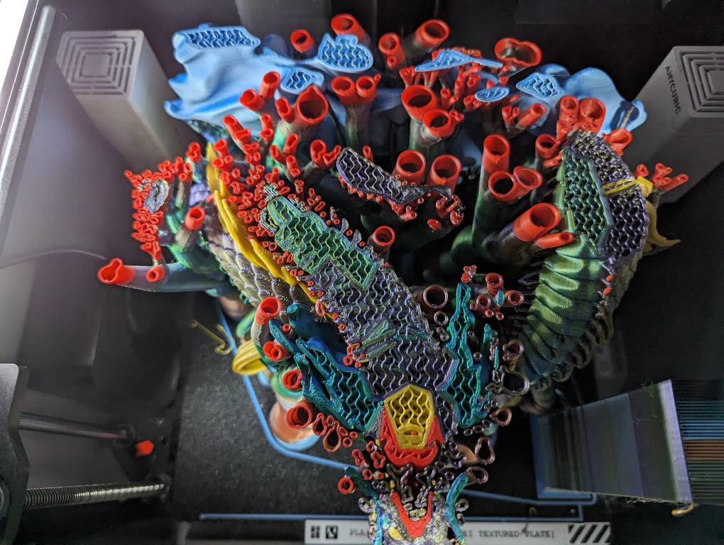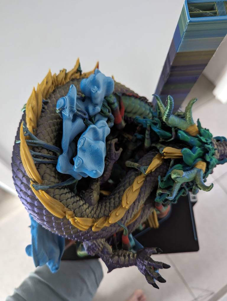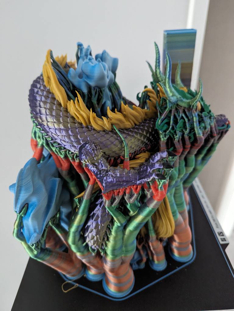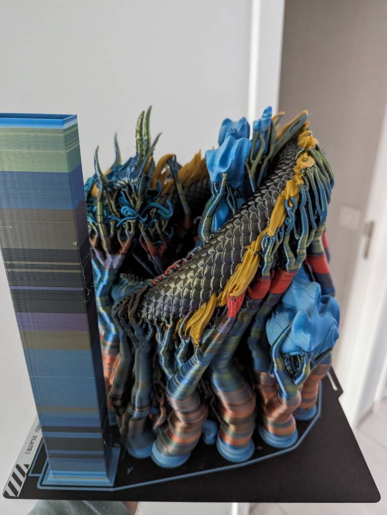 Deze fail gaf me de mogelijkheid om op die plekken (en nog een paar andere die ik opmerkte) kleur touchups te doen, niet alleen ging de color swap count naar beneden maar ook het filamentgebruik en tijdsduur. Print time ging van 7d 21u naar 7d 9u. Dus 12u eraf. Sta ik eigenlijk maar een dag achter. Hopelijk voltooid poging 2 nu succesvol volgende zaterdag