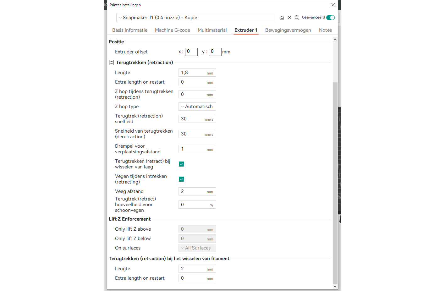 Moet ik verder nog wat veranderen aan de intreksnelheid...deze staan nu op 30mm/s