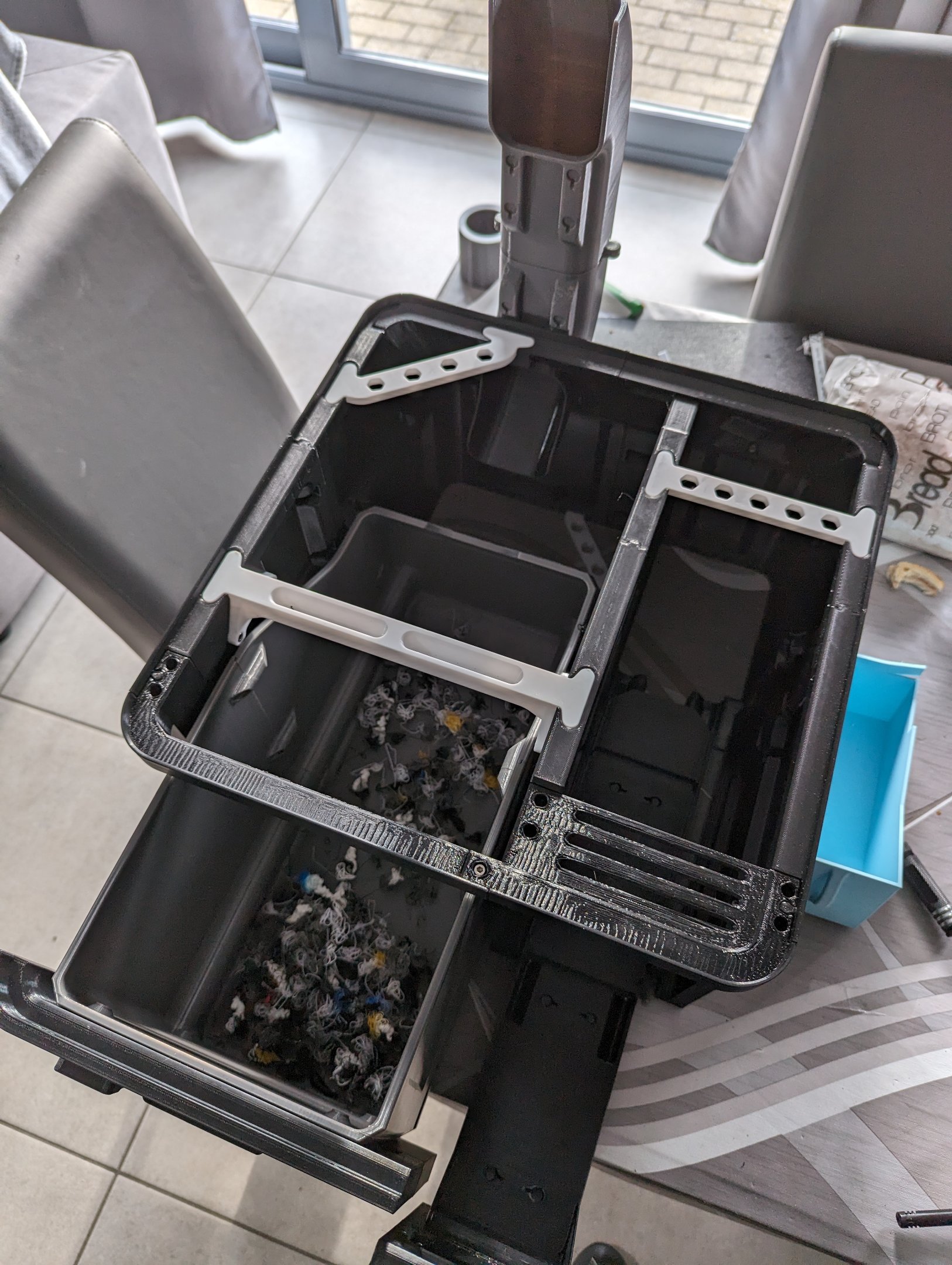 En dan m'n recentste project. Ik was het zat om bij dergelijke multicolor projecten als die draken steeds in een mum van tijd de zijdelingse opvangbak te zien vol lopen, en geen enkel model op printables of makerworld en dergelijke was echt groot. Allemaal een andere variant van een kleine opvangbak. Niet groot genoeg. Tot ik op Reddit [urlhttps://www.reddit.com/r/BambuLab/comments/1cbs ... cp1sp1p_v1]dit zag passeren[/url]. Was direct verkocht, maar maker gecontacteerd en die wist me te vertellen dat hij bezig was aan een HPV versie ervan "High Poop Volume", dus even gewacht en een goeie week geleden was dat ding eidelijk (weliswaar voor een bescheiden bedrag) te verkrijgen. Een kleine week printen en klaar! Moet nog de magneten plaatsen maar dan is dat ding klaar voor gebruik. En fuck die opvangbak is groot lol! Dat ding gaat niet direct vol lopen