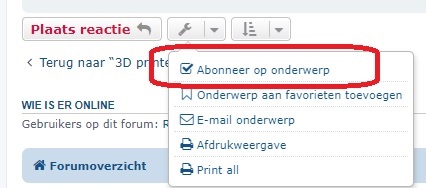 Als je een bericht wilt krijgen als er op je topic (of dat van iemand anders) een nieuwe reactie is gekomen, dan kun je je op dat topic abonneren door dat onderaan naast "Plaats reactie" in het menuutje aan te geven. Het is enigszins verwarrend omdat in dat menu bij "Abonneer op onderwerp" al een vinkje staat. Maar klik dat maar aan en je zult een pop-up zien waarin bevestigd wordt dat je dan op dat topic bent geabonneerd Als je er weer vanaf wilt kun je dat op dezelfde wijze doen of in je Gebruikerspaneel aanpassen. Zie onderstaande plaatje.