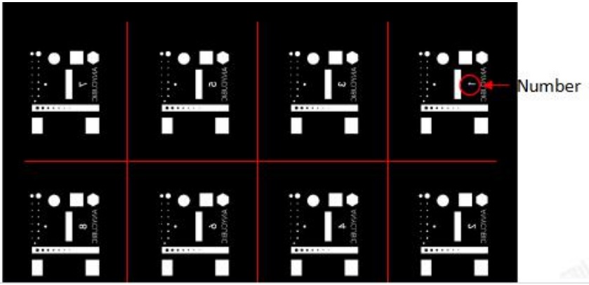 "R_E_R_F" is the abbreviation of "Resin Exposure Range Finder", R_E_R_F file can be used to test the best exposure parameters of resins from different manufacturers. Import the R_E_R_F file attached to the U disk into the slicing software. The R_E_R_F function will divide the screen into 8 equal parts in the order shown in the figure below. The exposure time of the model with model number "1" is equal to the "normal exposure time (s)" in the slice settings. ” (except the number of layers at the bottom), the other numbered models will be sequentially incremented with a gradient of 0.25 s. For example: When the "normal exposure time (s)" is 2 s, the model numbered 1 will be exposed for 2 s, the model numbered 2 will be exposed for 2.25 s, and so on.