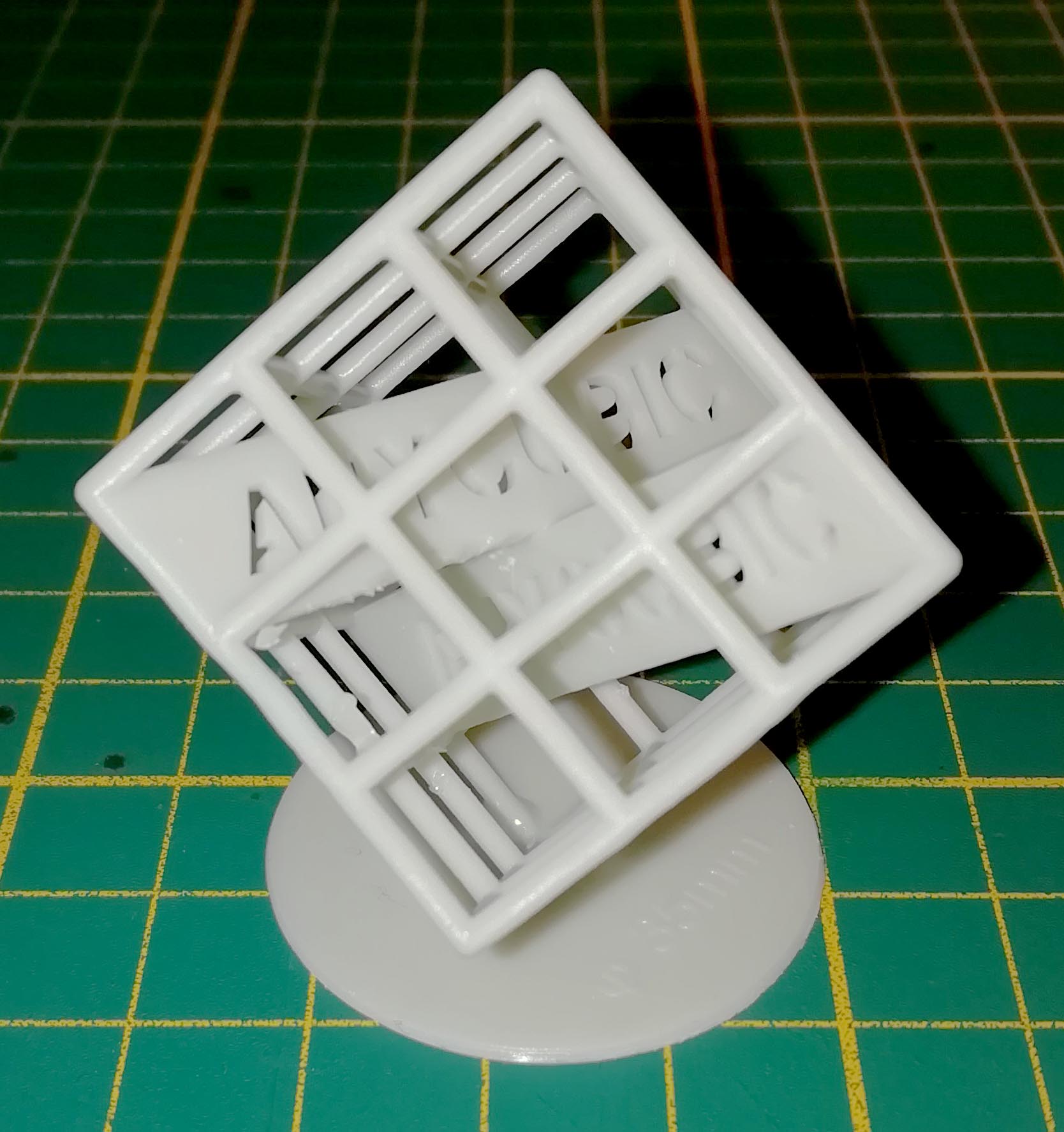 Net als bij de filamentprinter je niet onder een testprint van een Benchy uit kunt, is dat bij de Anycubic de testkubus. Dus uiteraard deze ook geprint. Eerst om te bepalen welke belichtingstijd ik nodig had de R_E_R_F test geprint. En nu dus de kubus.
