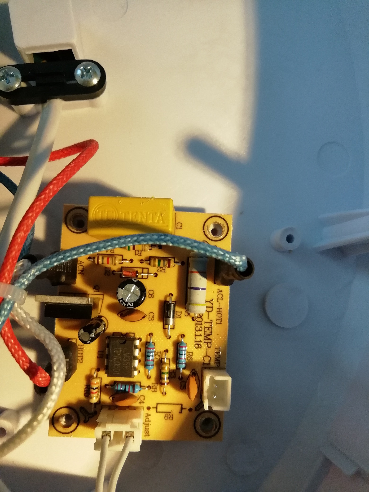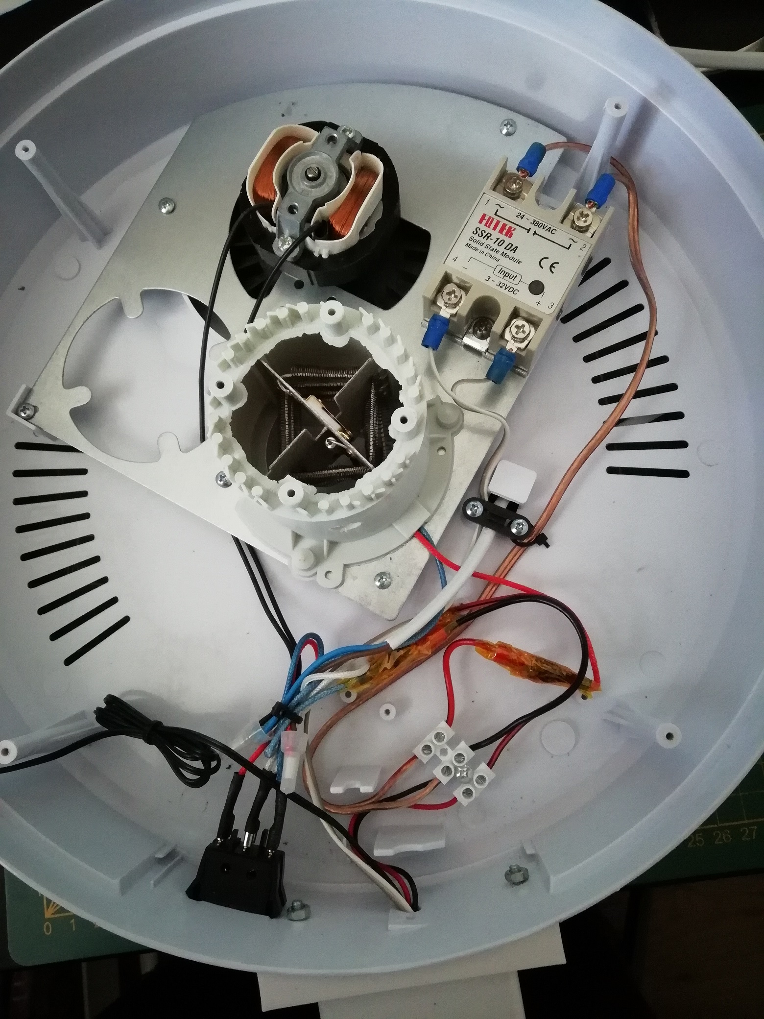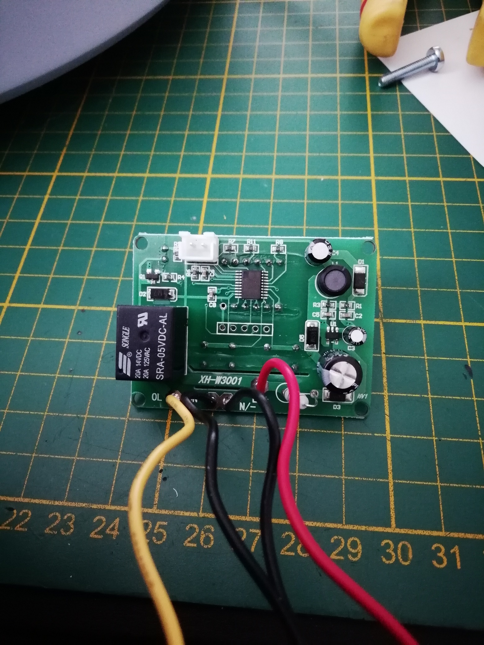 De regeling is eenvoudig, maar het lukte me niet om de maximale waarde op de print aan te passen zonder dat de andere instellingen weer niet klopten. Dus heb ik er toen maar een XH-W3001 ingezet. Daarvoor is het eerst wel nodig om een adapter te printen om deze aan de voorzijde in plaats van de originele regelaar te kunnen plaatsen. Omdat de XH-W3001 met een relais werkt heb ik die vervangen door een solid state relais. Een mechanisch relais is gedoemd om bij een kleine hysterese (schakelverschil tussen in- en uitschakelen) snel de geest te geven. Daarvoor heb ik het relais uit de XH-W3001 gesoldeerd en op de uitgang van het relais de solid state aangesloten.