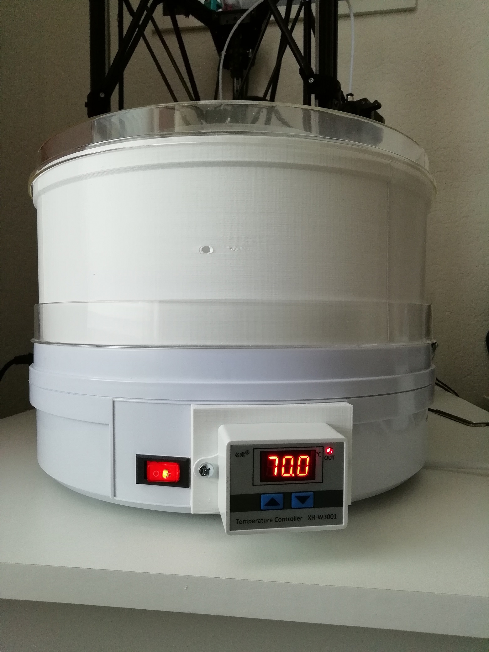 Verder moet er om de food dryer geschikt te maken voor het drogen van rollen filament eerst nog een wand geprint worden die op de food dryer komt met het originele deksel erop. De wand heb ik van Thingiverse gehaald. Ik heb er eentje gebruikt die in 4 of 6 delen geprint kon worden en in elkaar geschoven met gleuven. Er staan momenteel diverse alternatieven vermeld. Zoek op Food Dryer en er komt er vast eentje die geschikt is. Let erop dat je deze niet met PLA print aangezien bij 70 graden PLA niet meer hard blijft. Ik heb het met PetG geprint, maar ASA of ABS kan natuurlijk ook, al zal dat meer problemen geven als je geen verwarmde kast om je printer hebt.