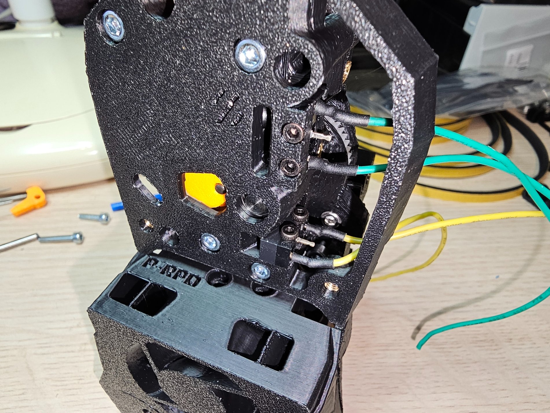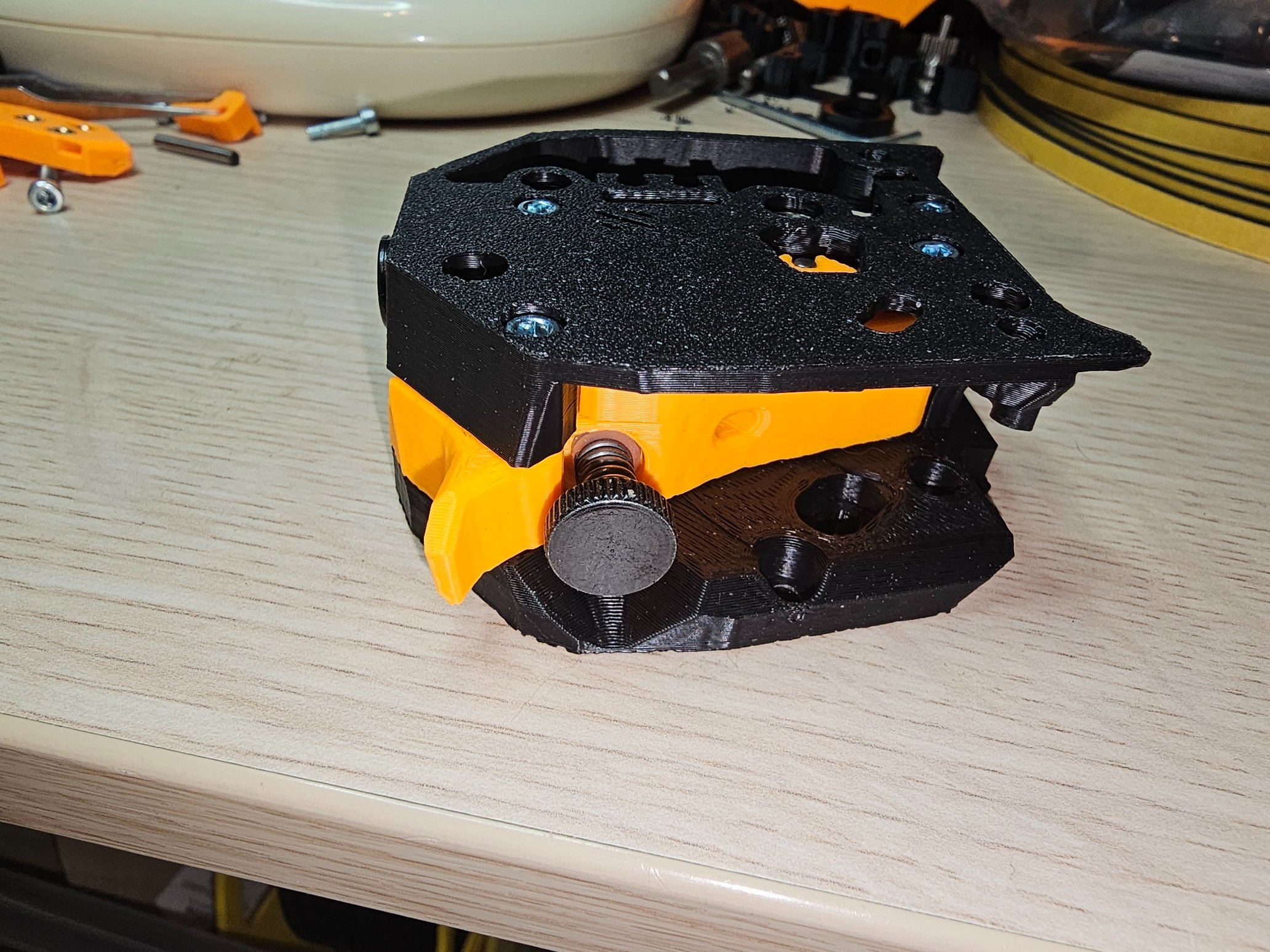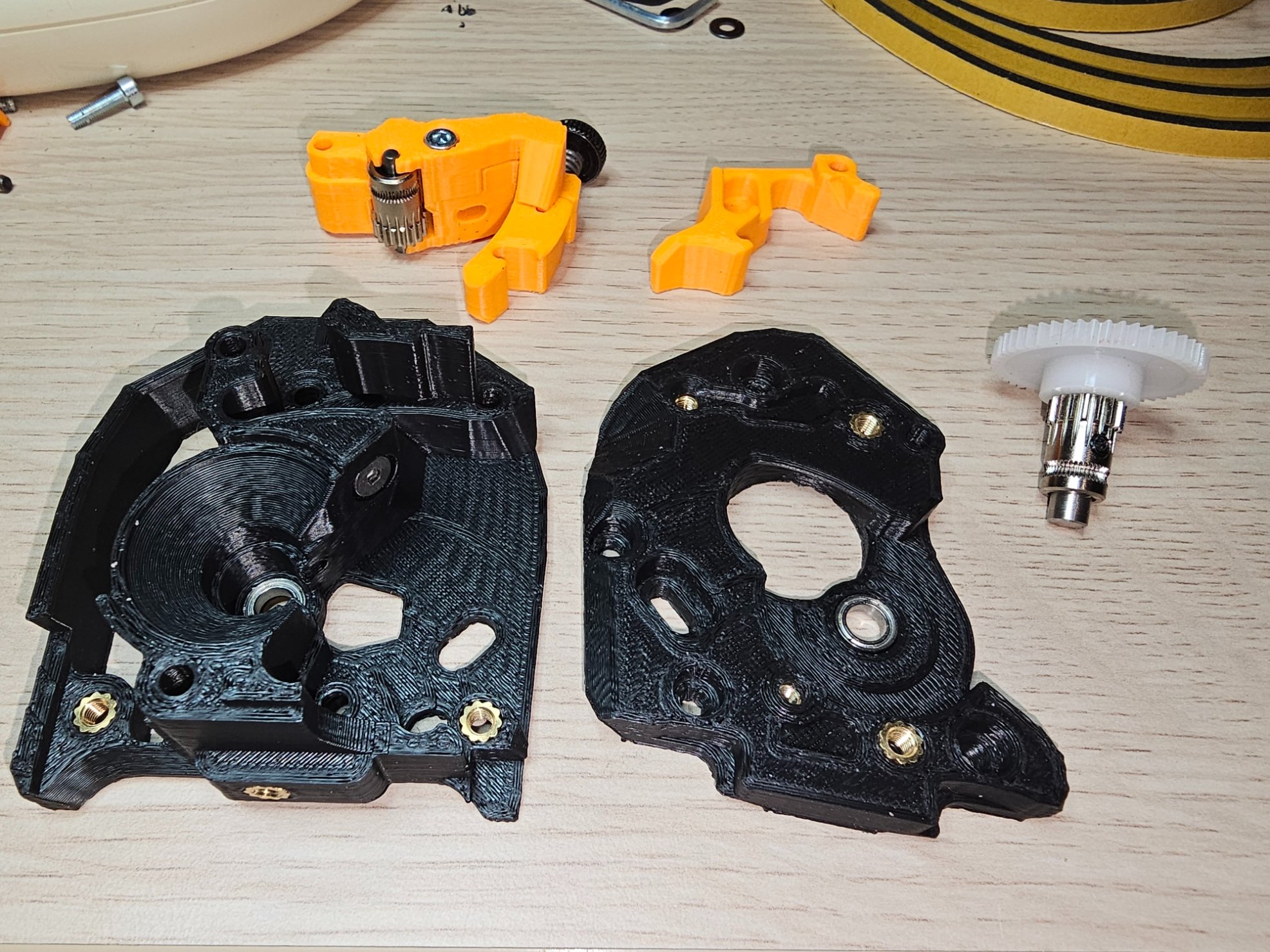 Deze extruder kan je weer volledig zelf printen. De versie welke ik gebruik heeft 2 extra sensoren ingebouwd om te bepalen in hoeverre het filament is ingevoerd. De eerste sensor zit voor de tandwielen welke het filament doorvoeren. De 2e sensor zit achter deze tandwielen. Dit moet straks voor de ERCF een goede indicatie geven hoeveel filament er nog doorgevoerd moet worden voordat het nieuwe filament klaar is om geprint te worden. Op de onderstaande fotoos zitten deze sensoren nog niet gemonteerd, ben mijn zakje met microschakelaars weer eens kwijt..... Ze moeten hier ergens liggen, maar ja, waar....
