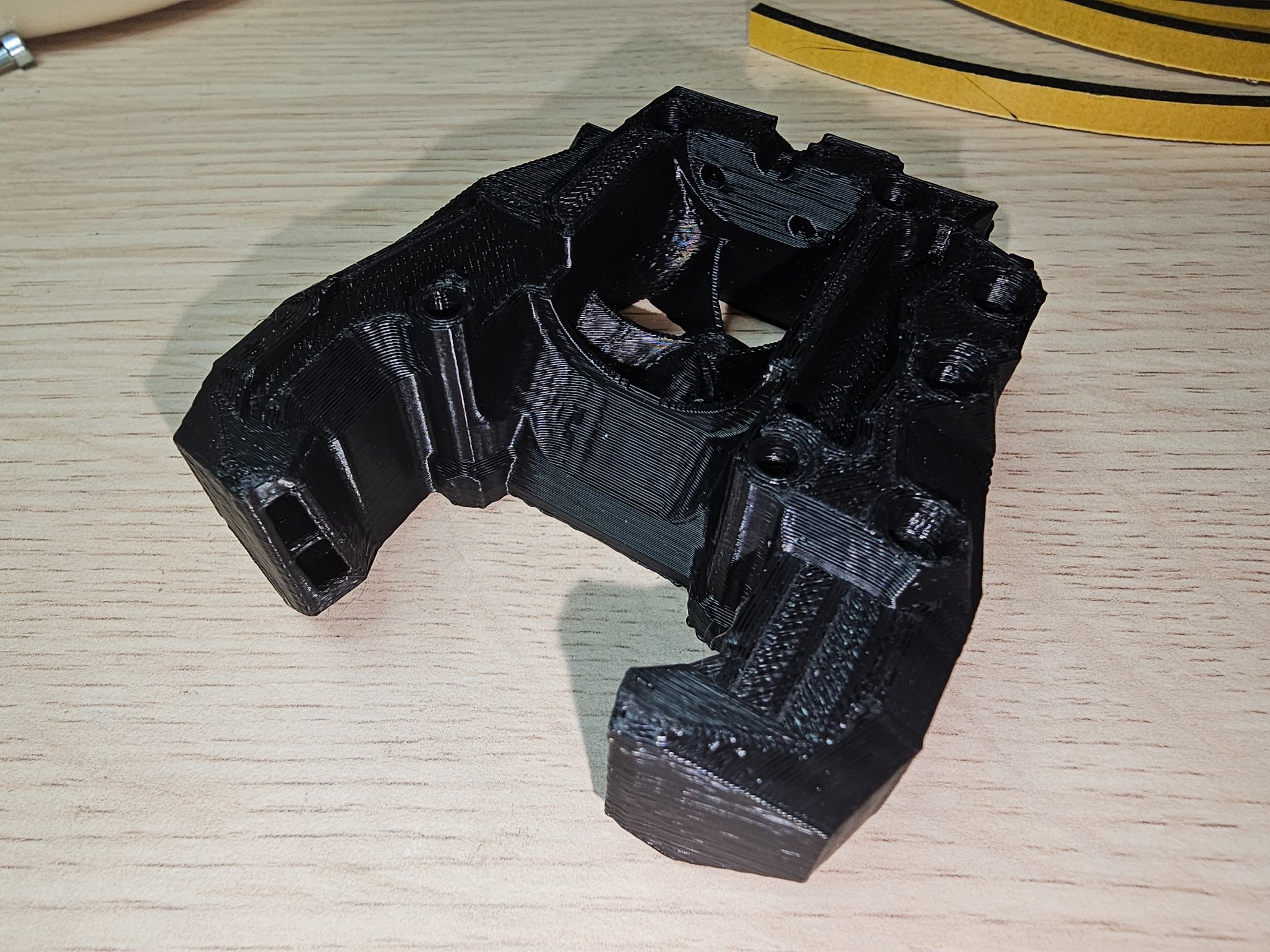 Hiervoor heb ik andere bevestigingen geprint. Hij staat hier nog even kaal bovenop de balk. Straks bij de werkelijke ombouw worden alle onderdelen van het loopwerk omgezet.