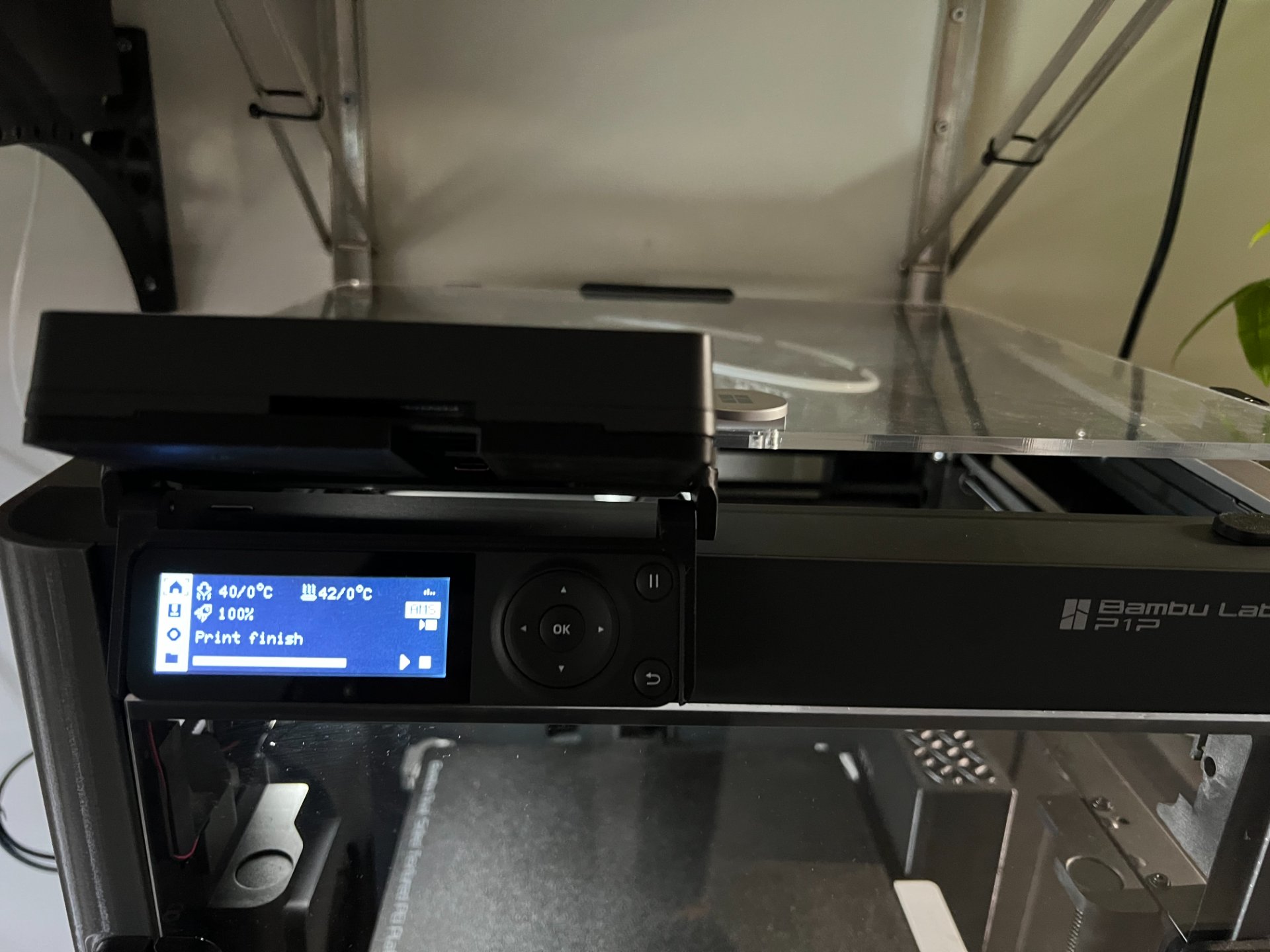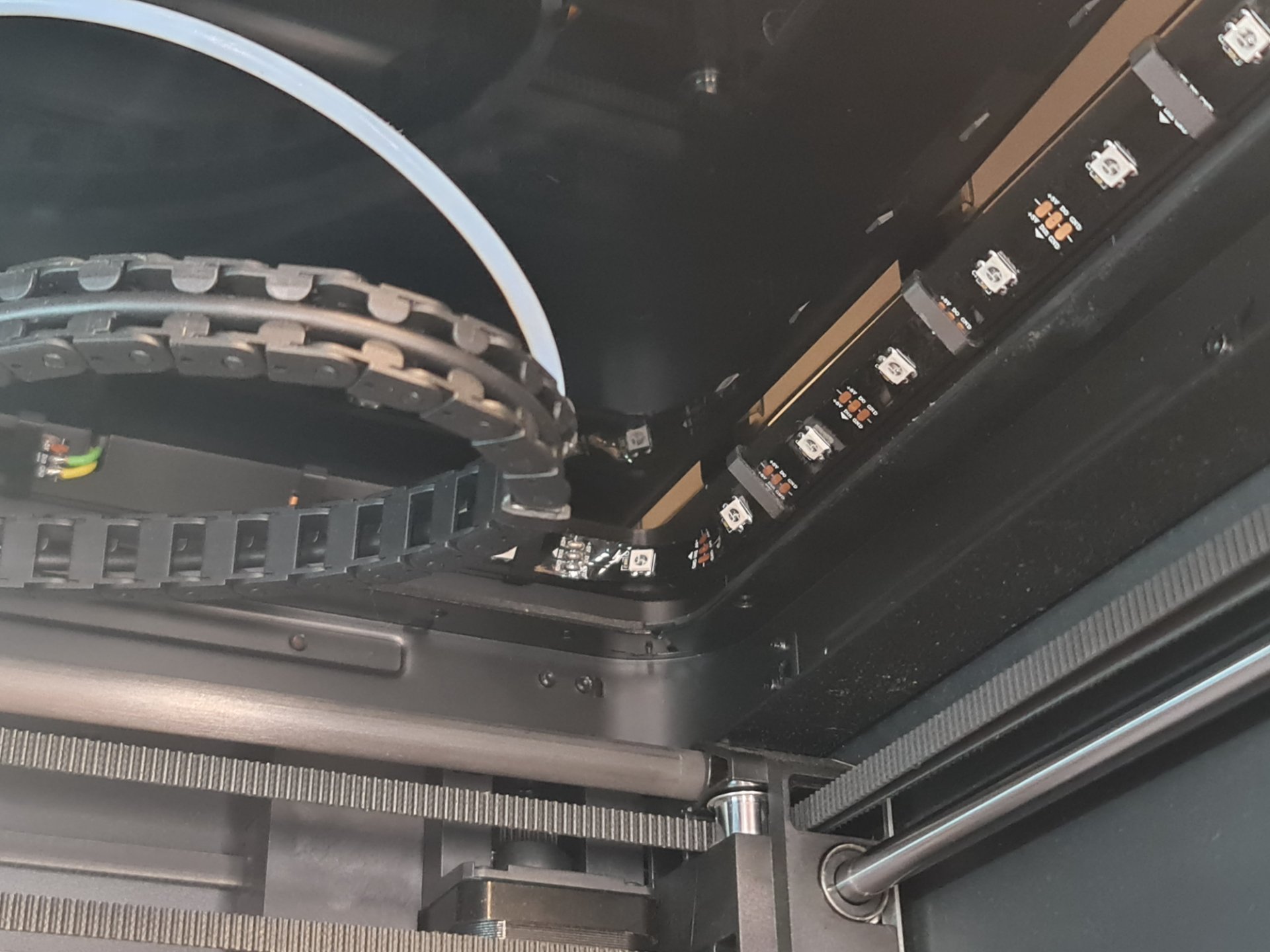 Omdat bij het printen van PLA en PetG het nodig kan zijn om het bovenglas te openen maar dat met de AMS erop niet gaat (behalve als je het wat kantelt met een hefblokje) een verhoging met schuifbare glasplaat en kantelbare AMS geprint net als de bijbehorende LED verlichting. Ik heb voor kleurenverlichting gekozen die ik nog had liggen.