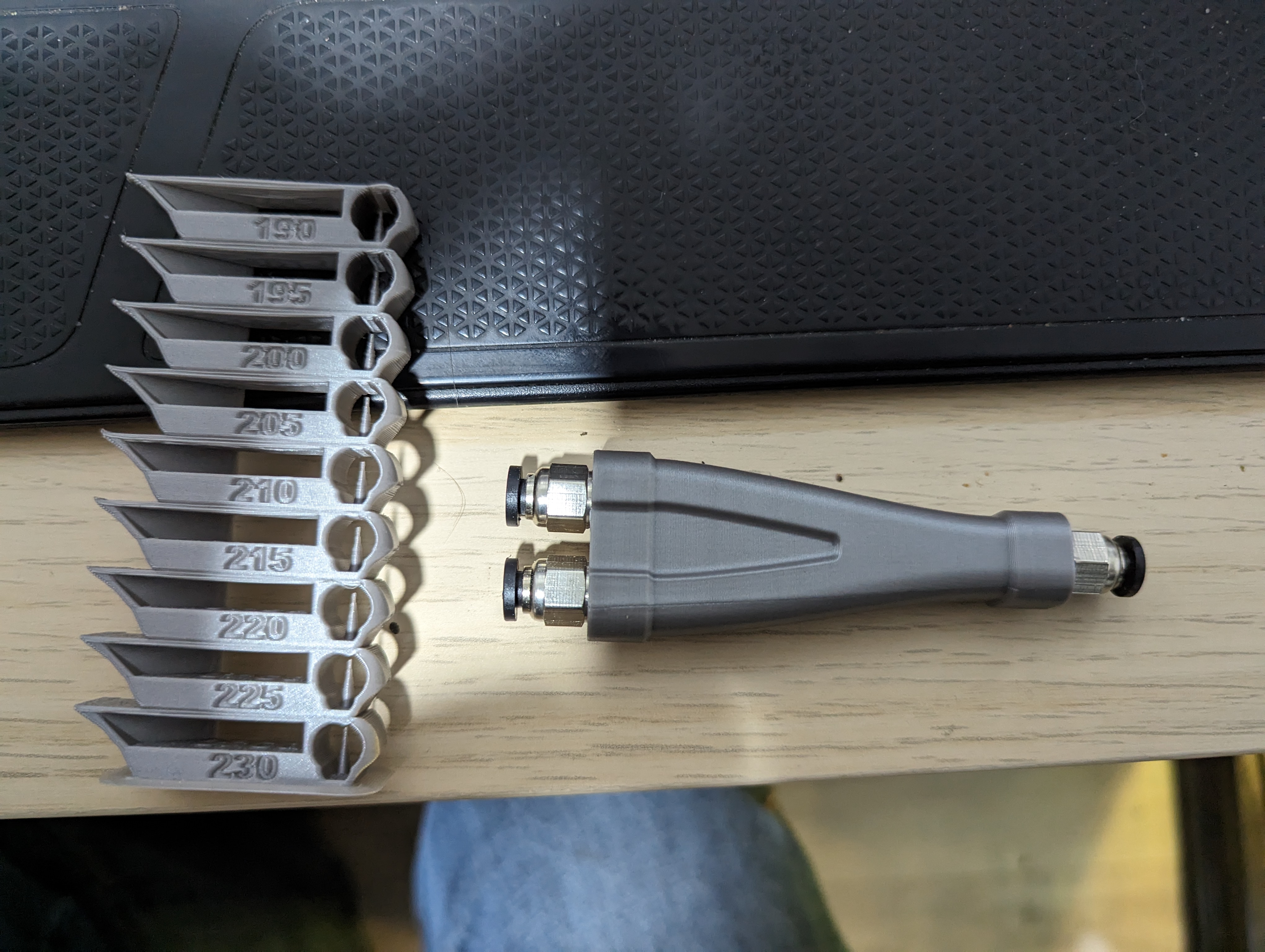 Uiteraard een temp tower daar andere printer = andere omstandigheden, en rechts een Y-splitter voor de ptfe tube. Waarom een y-splitter. Well in de standaard configuratie kan je OFWEL de AMS gebruiken, OFWEL de externe spoel. En dan moet je alsnog steeds de ptfe tube invoer wisselen. Met zo'n y-splitter is dat niet langer nodig. De AMS retract automatisch na het einde van een print het filament helemaal terug tot in de AMS, nadien kan je gewoon het filament van de externe spoelhouder richting de extruder invoeren. Een linkje naar een ander model, maar schept een idee.