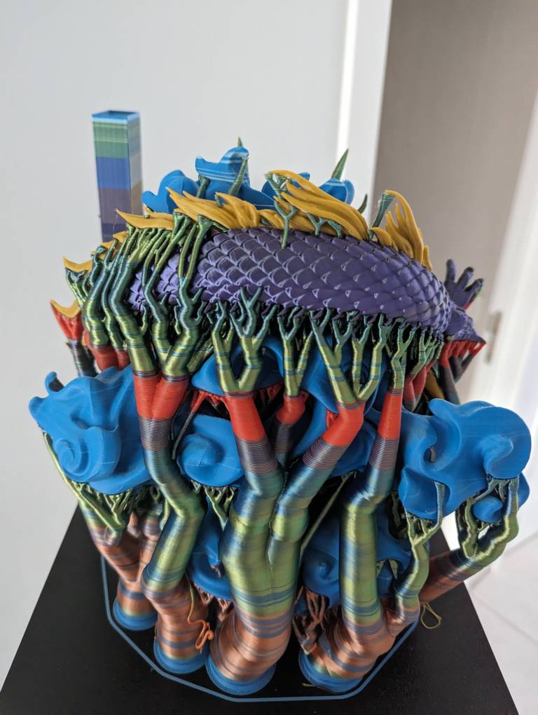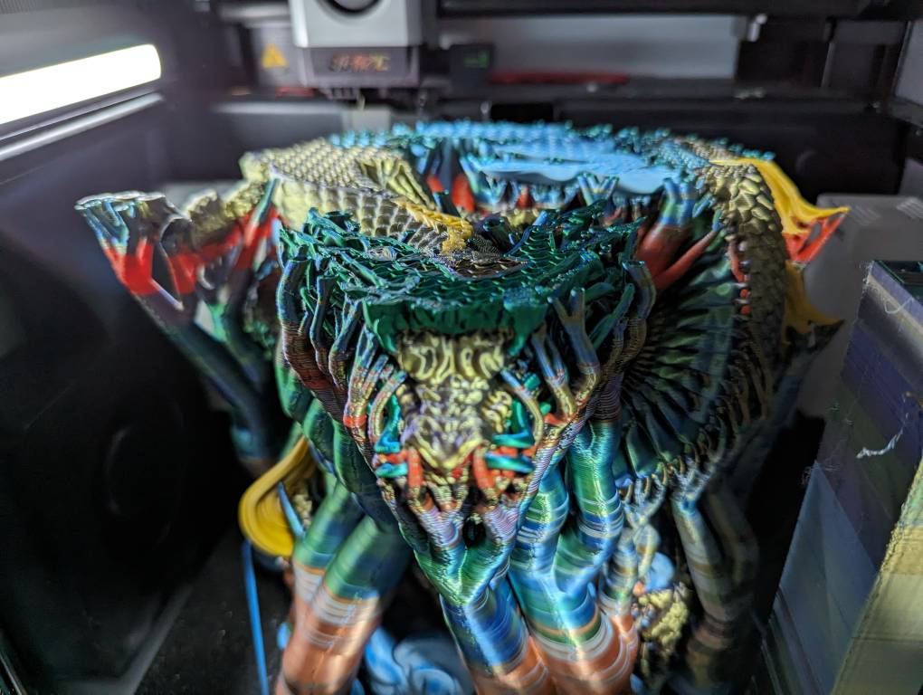 Deze fail gaf me de mogelijkheid om op die plekken (en nog een paar andere die ik opmerkte) kleur touchups te doen, niet alleen ging de color swap count naar beneden maar ook het filamentgebruik en tijdsduur. Print time ging van 7d 21u naar 7d 9u. Dus 12u eraf. Sta ik eigenlijk maar een dag achter. Hopelijk voltooid poging 2 nu succesvol volgende zaterdag