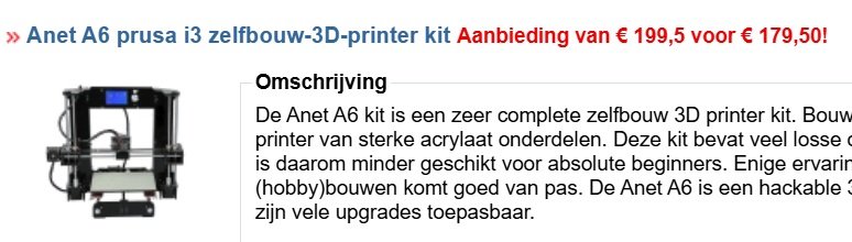 Inderdaad. Als je bedenkt dat 6 jaar geleden de Anet A6/A8 al rond die prijs zat en kwalitatief een stuk minder is/was. Hieronder een screenshot van 123-3D.nl van hun website uit 16 januari 2019. (Via het internet archief Wayback machine)