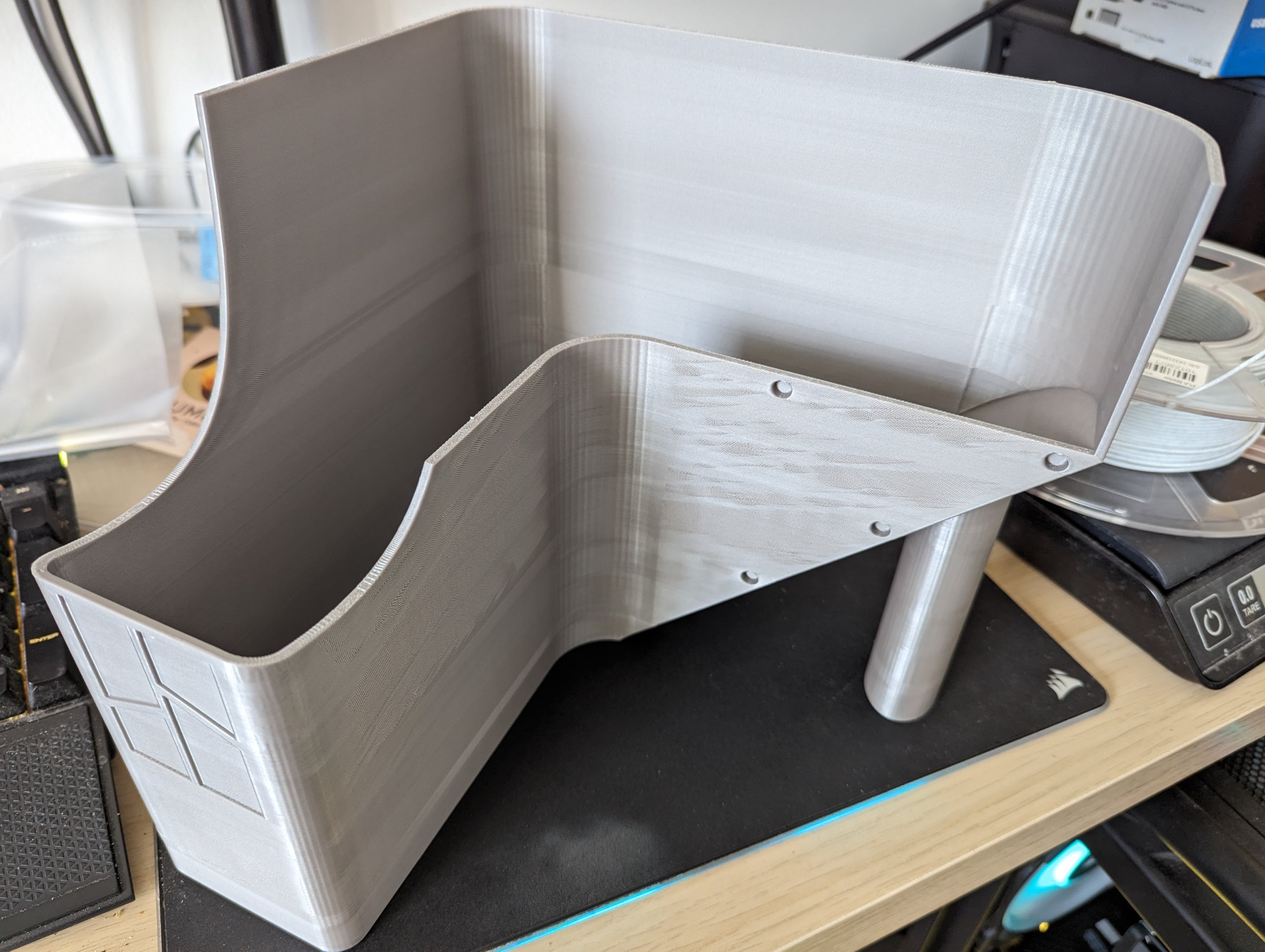 Ik zou dan toch de P1S over de P1P aanbevelen. Nu, volgende printje klaar! in iets meer dan 5u. De poop chute in ludacris mode (500mm/sec), met de nodige defectjes van onderextrusie (waarschijnlijk door dat 230g nog niet hoog genoeg was om vlotjes te smelten aan die snelheid). De 1e 1,5cm is wel netjes. Nu ik ga er niet moeilijk over doen, het is tenslotte maar een opvangbakje, dus rekening houdend met de printsnelheid valt de printkwaliteit zeker nog zeer goed mee.