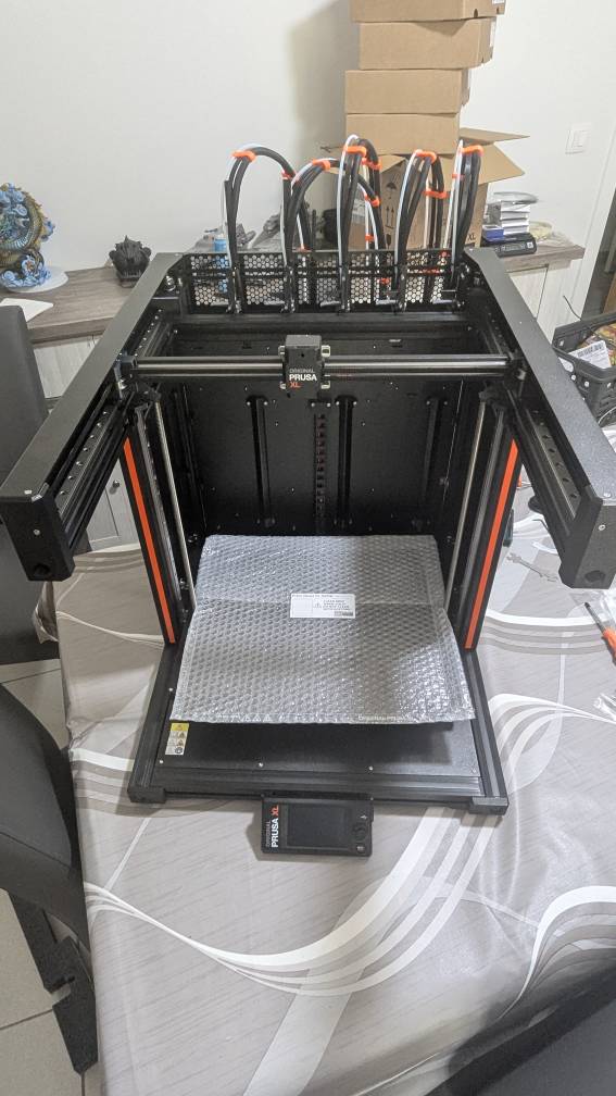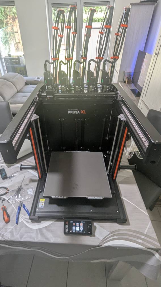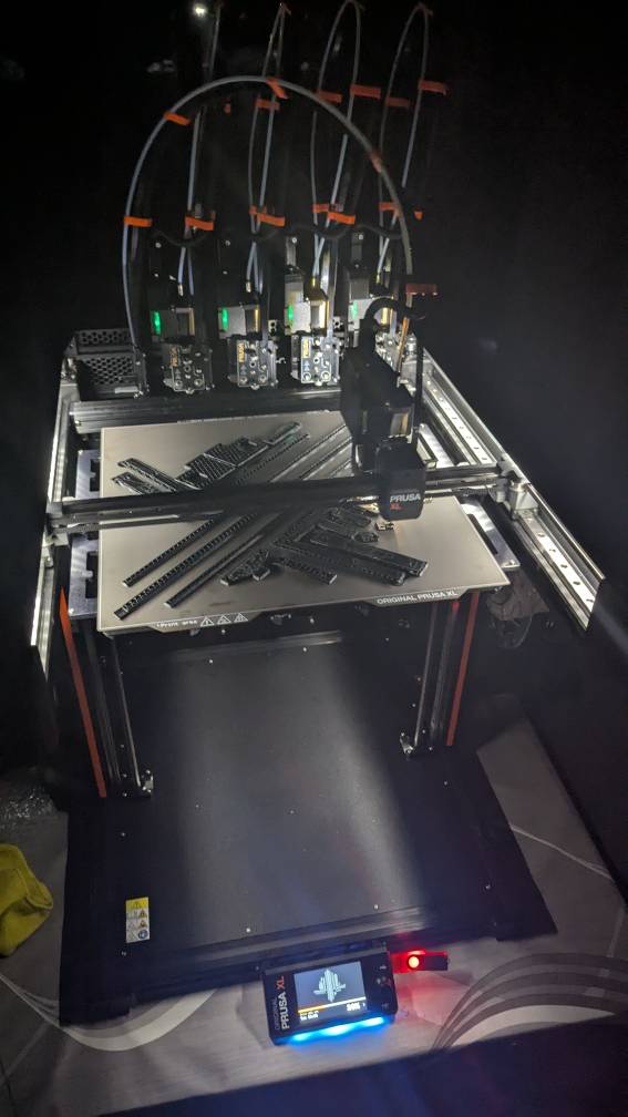 Het verschil zit em echter dat die toren je enige "afval" is na een multi-kleur/multi-materiaal print. Bij m'n X1C, heb je die kleine poepjes zoals je je misschien nog herinnert van m'n draken prints die makkelijk een richting 1kg of meer kunnen gaan ;). Dat heb je dus NIET bij een PrusaXL, daar die met verschillende spuitkoppen zit en er dus NIET telkens gepurged moet worden bij het wisselen van kleur. De printer pakt gewoon een andere kop waar het juiste materiaal op zit en gaat gelijk verder waar de gebleven is met de nieuwe spuitkop, al is het wel handig om zo'n wipe/prime tower te gebruiken om de druk op te bouwen.