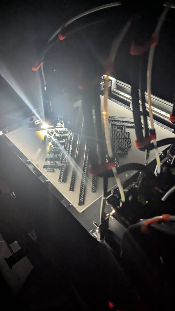 Voorlopig alles goed. Zelfs de kleine vierkantjes blijven plakken op het satin bed, zonder lijm of brim. En ook in het donker gaat dat ding lekker voort.
