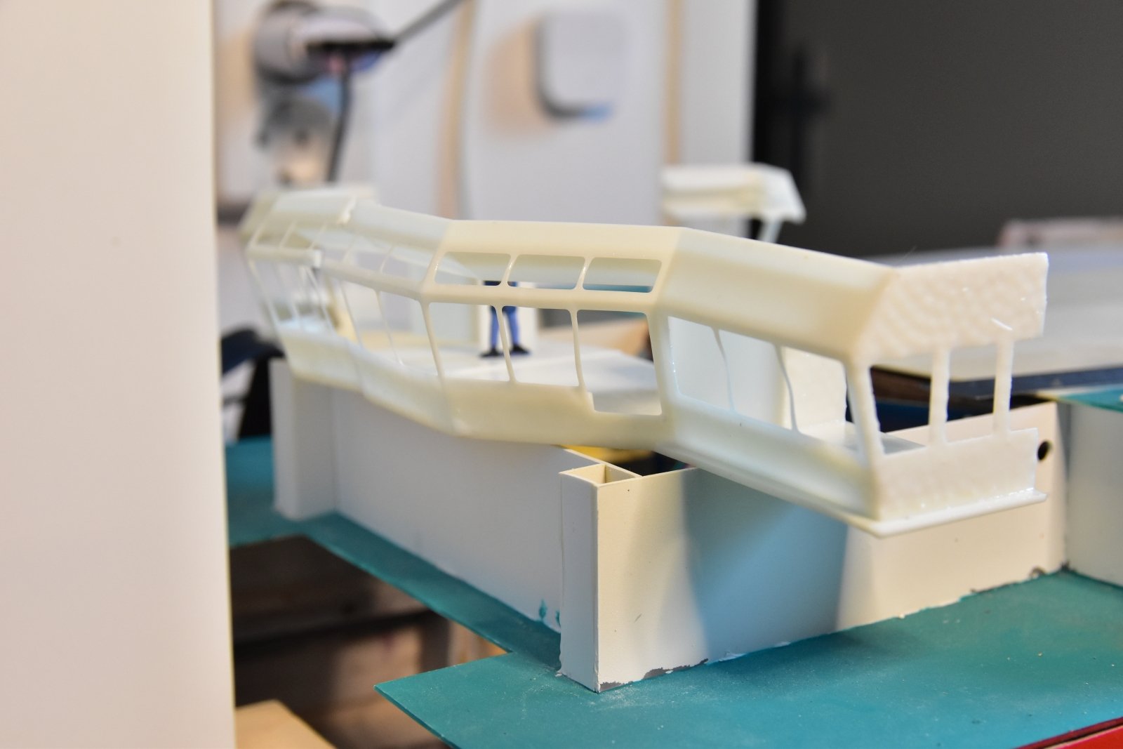 Zie onderstaande foto's voor het resultaat, de kg witte resin is inmiddels nagenoeg op. Het printen van het stuurhuis gaf in eerste instantie niet het gewenste resultaat met een vloer van 1mm dik die cm's krom trok en met supports op de 0,5mm dikke raamstijlen die dus verloren van de supports. Met de nieuwe versie met 3mm dikke vloer is prima geprint, al is er wel een kier waar de ramen bij elkaar komen, al is dat nog wel aardig op te vullen met wat plamuur.
