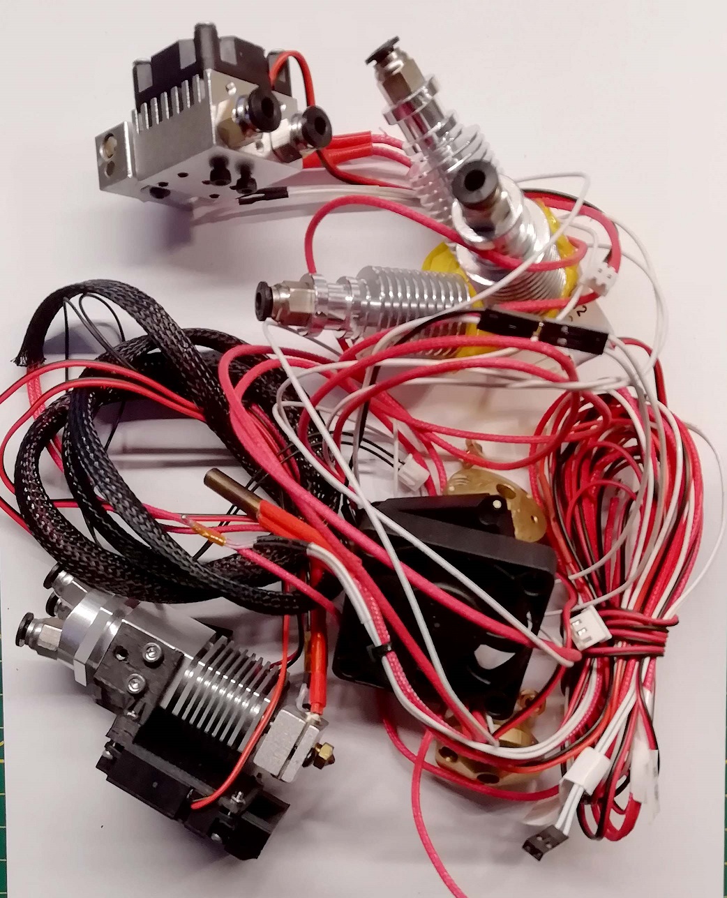 Een bak met twee- en driekleuren koppen. Mogelijkheid om met meerkleuren koppen te experimenteren. Zijn gebruikt. Geen garantie dat alles compleet is. Sowieso is er voor elke extra kleur een stepper motor en een extruder nodig. Deze worden niet meegeleverd.