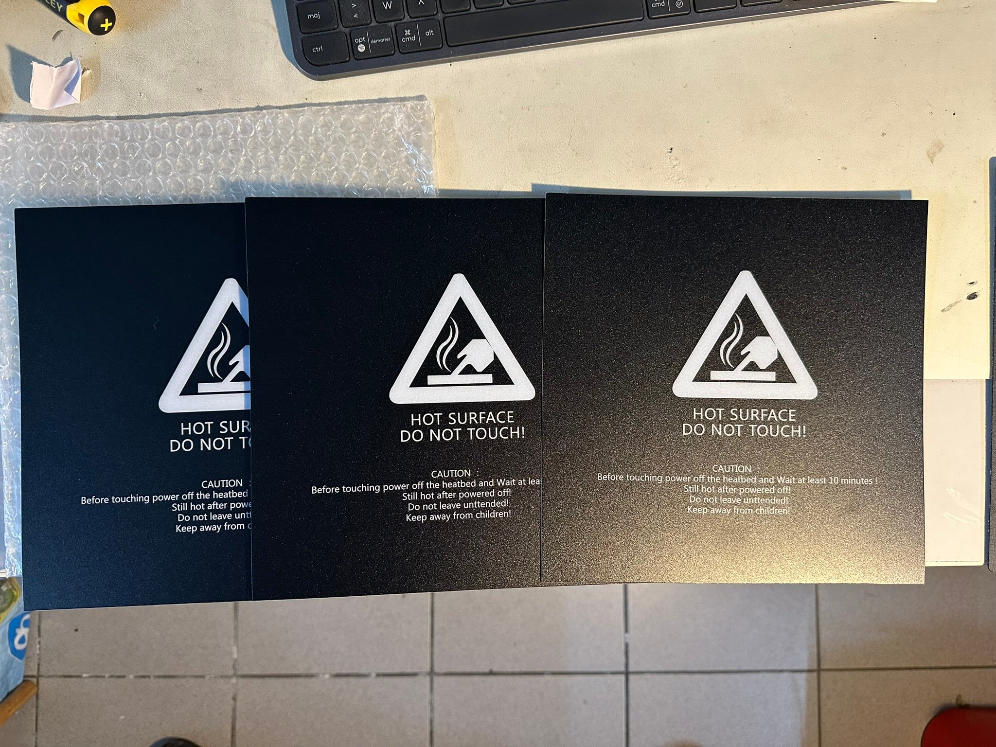 1x magnetisch printbed voor Ender 3 - nieuw nooit gebruikt - bestaat uit 2 delen; 1 magneetsticker om om het printbed te kleven en 1 afneembaar printvlak - Te koop voor 5€ 3x "Buildtak" stickers +- 210 x 220mm - nieuw - Deze had ik in een 5-pack gekocht en heb er 2 van gebruikt. Goede hechting voor PLA en PETG - Te koop alledrie samen voor 5€ 5x printsticker - nieuw - nooit een kans gehad om dit uit te proberen - gratis voor de eerste die 1 van bovenstaande koopt