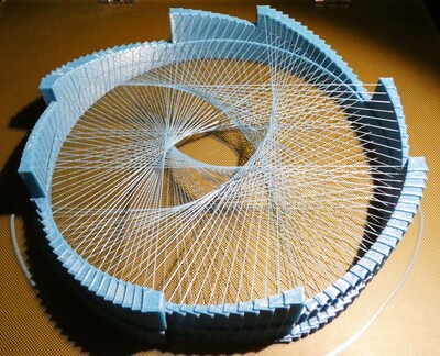 En support is met dit soort printing niet mogelijk. Je kunt niet een enkele draad van 0,3 mm support geven. Het is "gewoon" bridging. Maar dan over een afstand van 20 cm. Heel bijzonder is het ook niet want de draad trekt strak omdat hij krimpt op het moment van afkoeling. Je koeling moet dus wel in orde zijn. Maar een te warm printbed of een omkasting kan ook roet in het eten gooien. Ook moet de printtemperatuur en snelheid goed zijn want anders kan het zijn dat de draad knapt omdat hij bij de eerste aanhechting dunner wordt tijdens het transport naar de overzijde. Dat komt omdat eraan getrokken wordt. Is de temperatuur en/of de snelheid te hoog dan trekt hij bij de eerste aanhechting kapot.