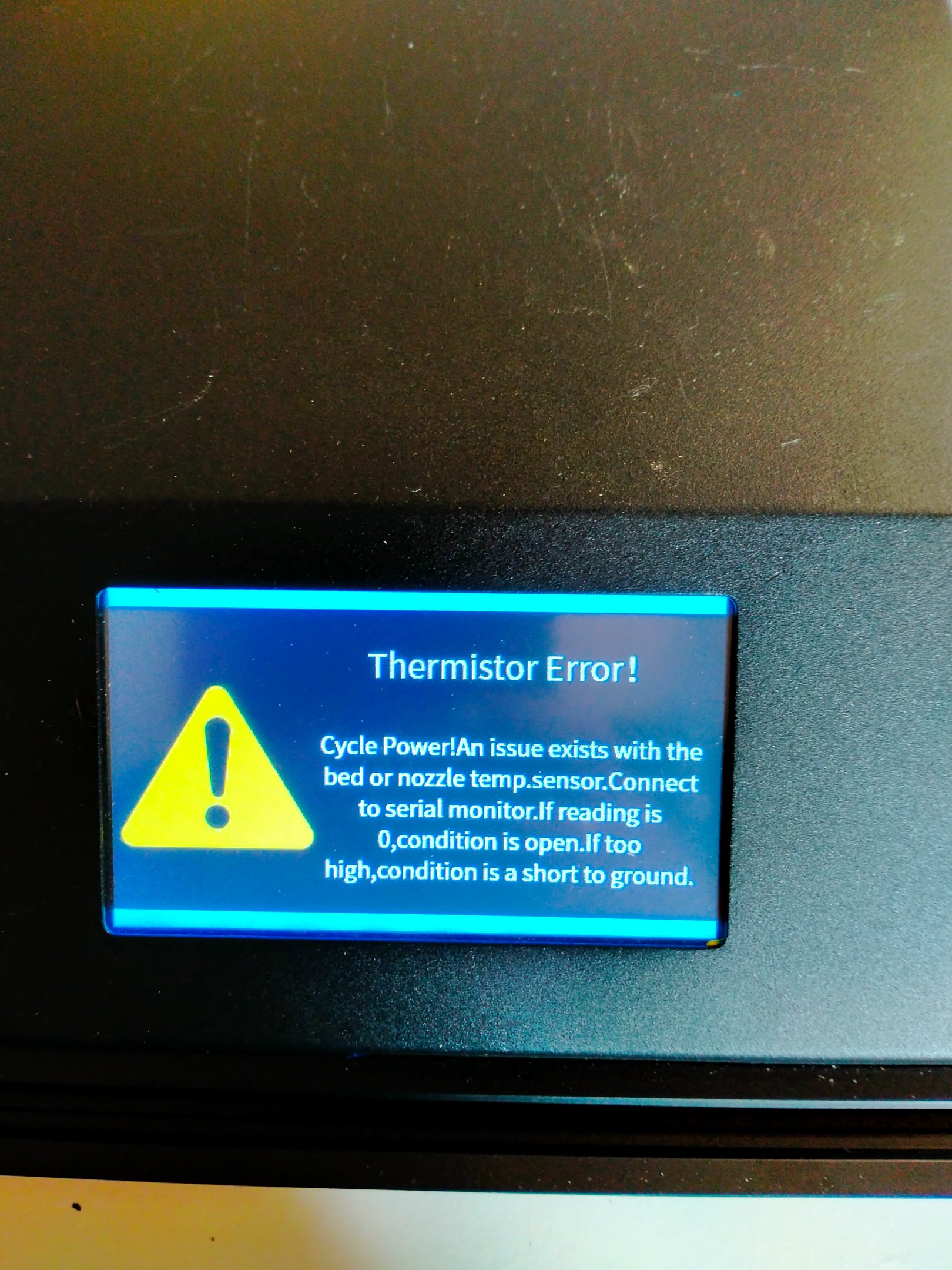 Het is mij ook wel eens overkomen dat een thermistor beschadigde bij het wisselen van een nozzel. Vaak zijn het ragdunne draden die bij lichte krachtinwerking al kunnen breken. Misschien heb je dus een nozzel vervangen en daarbij de thermistor (weerstandvoeler) beschadigd