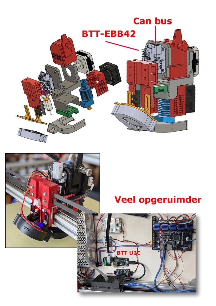 Vandaag mijn printer omgezet met besturing via een Can-Bus van BigTreetech, werkte direct goed, ik moest hiervoor wel een compleet nieuwe printkop ontwerpen, in ieder geval is het nu wel veel makkelijker geworden om iets te vervangen wanneer er iets defect raak aan de kop, ook is de kans veel minder groot wat betreft kabelbreuk, er zitten nu nog maar 4 draden (+/-24v en 2x data) in de slang naar de achterkant van mijn printer, maar zoals de titel aan aangeeft, niet omdat het moet maar omdat het kan en het houd mij bezig met de 3D print hobby.