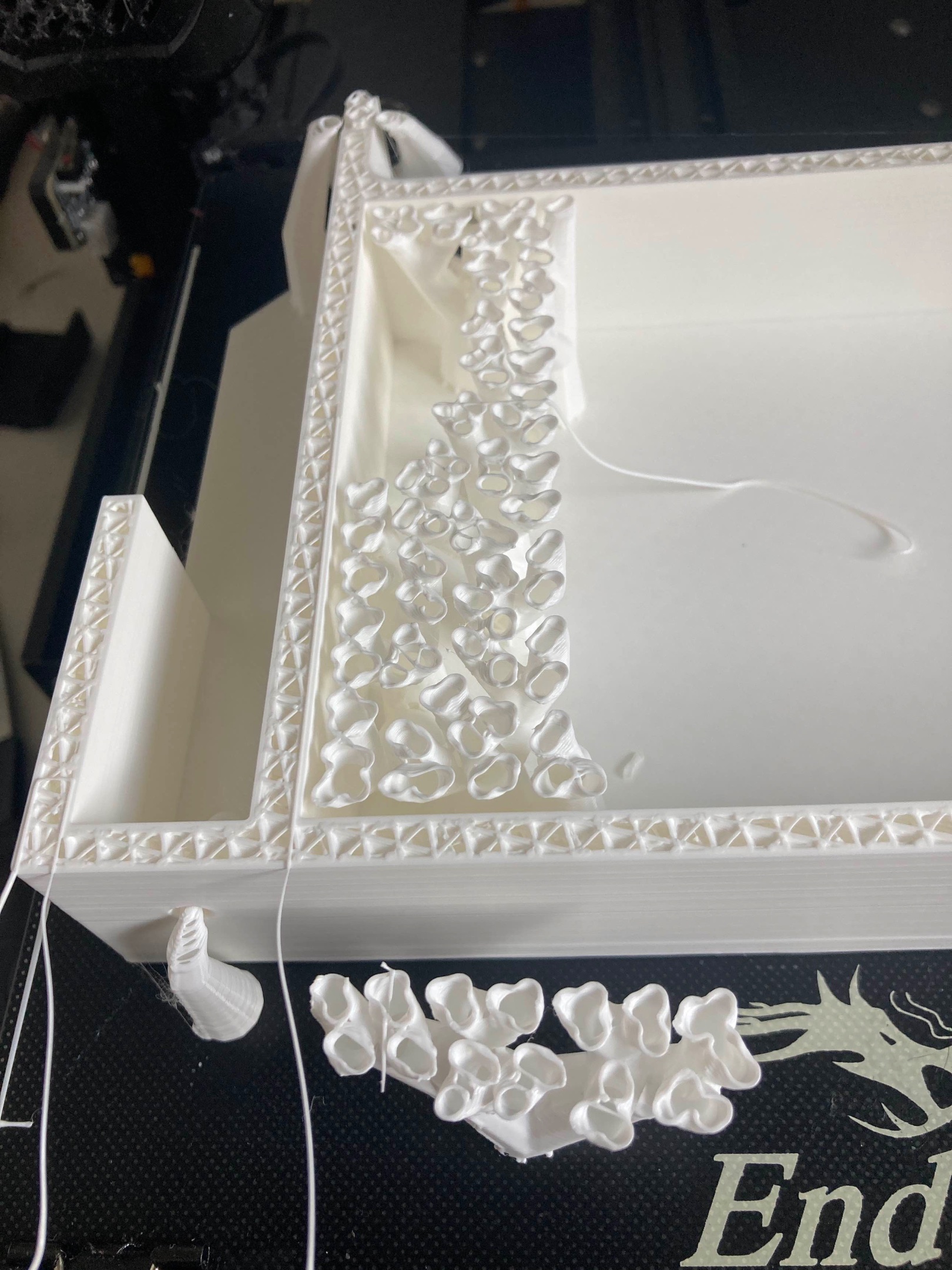 @hardy, dat gaat niet werken. Als ik het goed zie probeert hij een doos te printen met een enorme vrije overhang. Daardoor wordt er een enorm bos geprint om te ondersteunen. Als de printer dat gaat vermijden dan komt er geen "deksel" op de doos.
