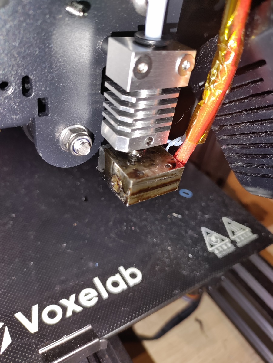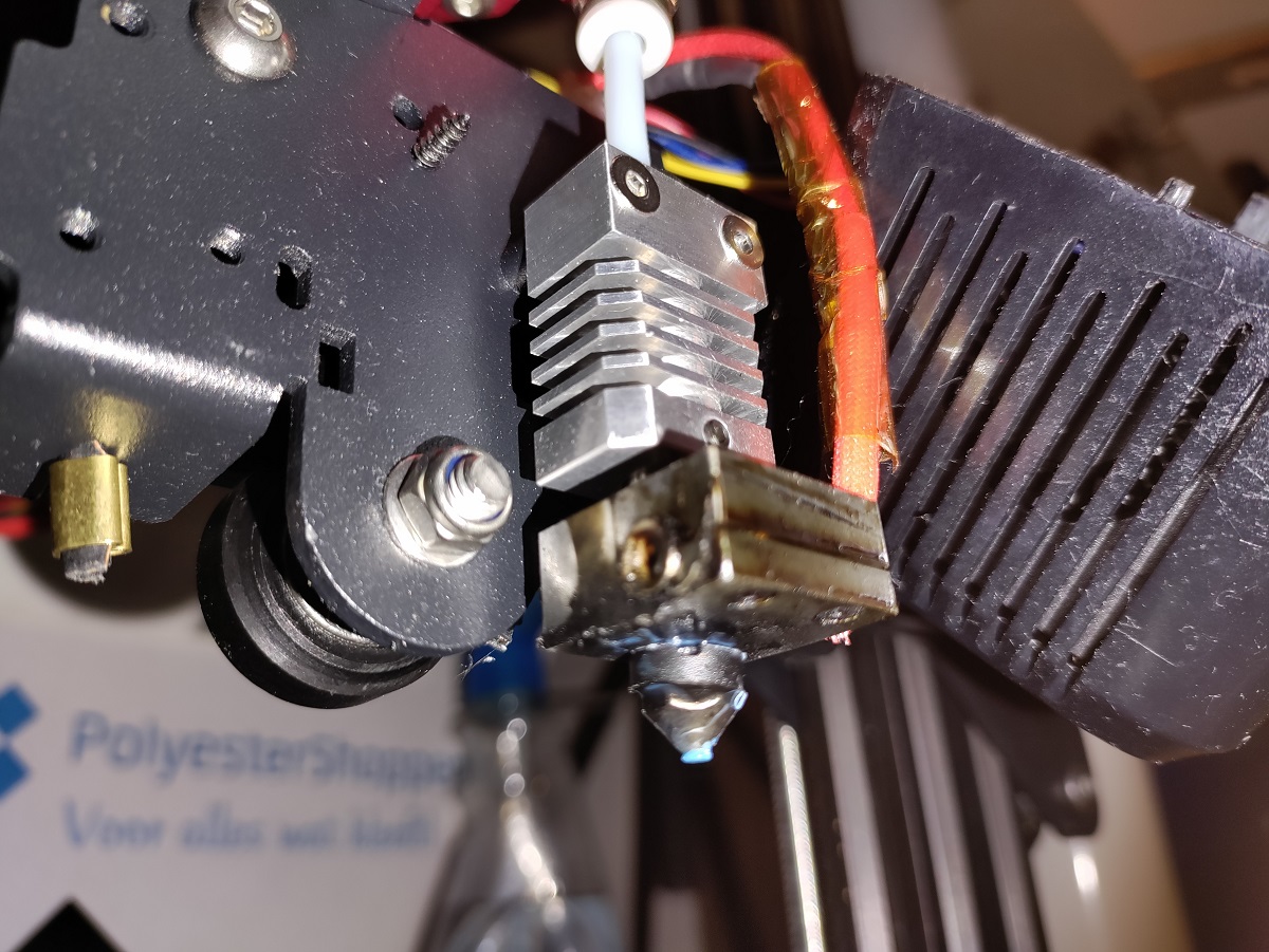 Per saldo heb ik nu een Voxelab Aquila met Bigtreetech electronika, dubbele Z-as en direct drive met Micro Swiss hot end. Sinds ik deze hot end erop heb gezet heb ik even succesvol kunnen printen zoals hierboven aangegeven. Helaas stopt het materiaal al na een paar lagen met stromen naar de plek waar het moet komen. Zoals onderstaande foto laat zien lijkt het wel erg heet op andere, niet gewenste plekken te komen: Wat zou dit problemen kunnen veroorzaken? Volgens de printer zou de hotend niet heter zijn geworden dan 215gr, maar vaker hooguit 200- 205gr.